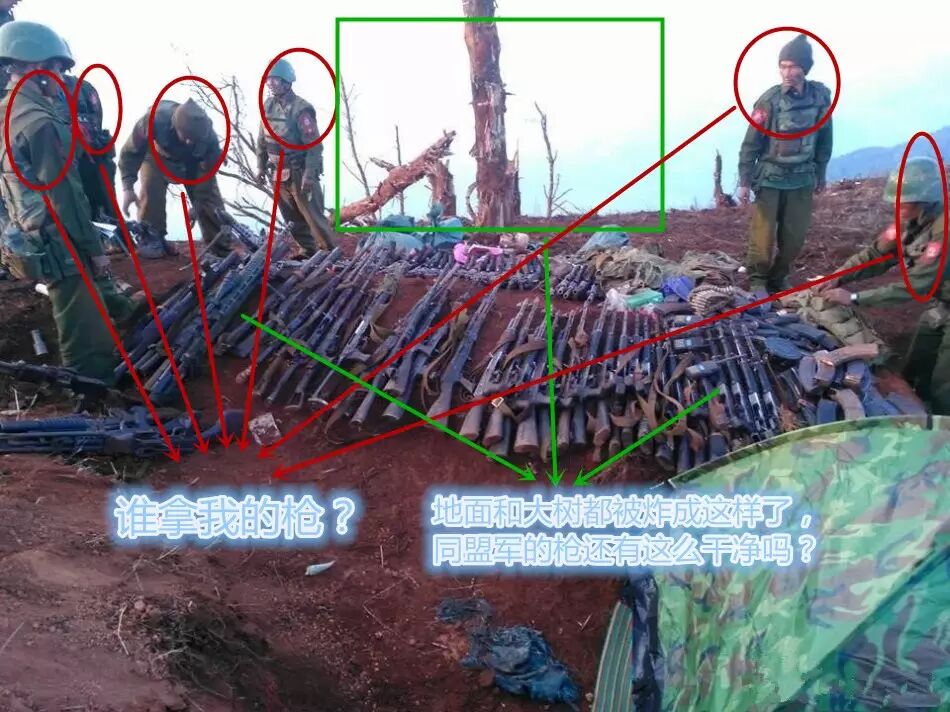 其次政府军的密集轰炸,同盟军驻守的整个小山包都变了样,再看看图中的大树都被炸成这样,同盟军的枪还会有如此之干净、完整吗?再三,图中政府军的枪都哪里去了?.......
