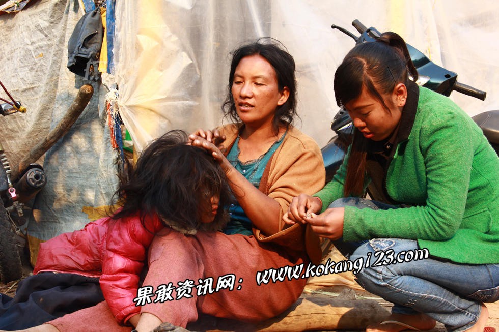 难民营里,一位母亲正在给女儿梳头。 (来自:腾讯图片)