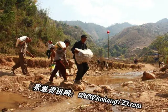2月以来缅甸政府军和果敢同盟军之间武装冲突不断,大批果敢难民逃亡中缅边境线的难民营里安营扎寨、躲避战火。图为中缅边境一处难民营,果敢难民雄仔和他的朋友在搬运捐赠的粮食和蔬菜。