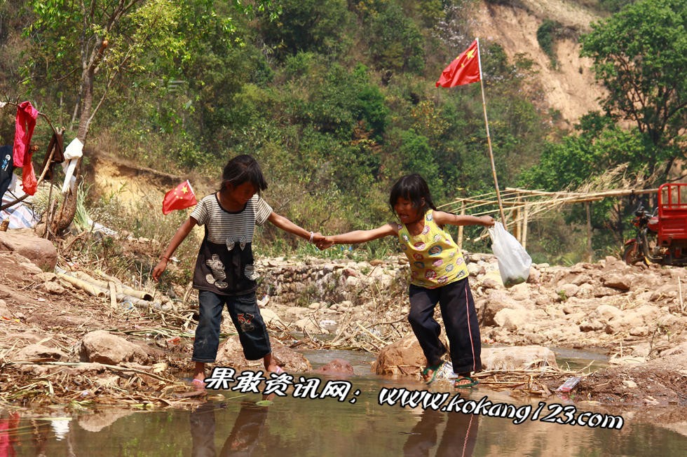 难民营就建在一条河边,以河为界,分属中国和缅甸国境。两名小孩牵手过河。 (来自:腾讯图片)