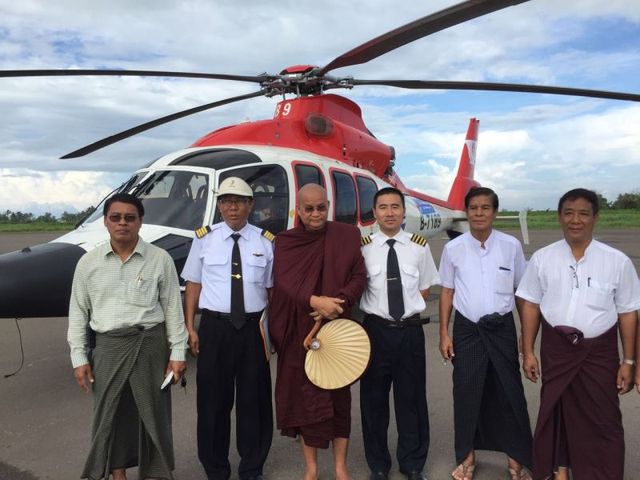 据8月12日消息 8月10日,若开邦佛教大和尚Myouk Oo Sayardaw Ashin Wara Mainda亲自搭乘中信集团直升机巡视若开灾情。