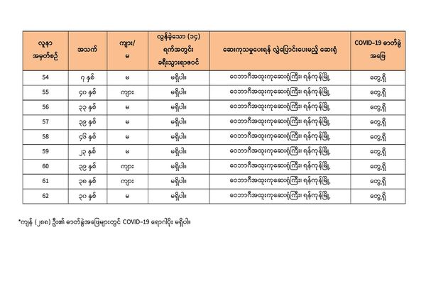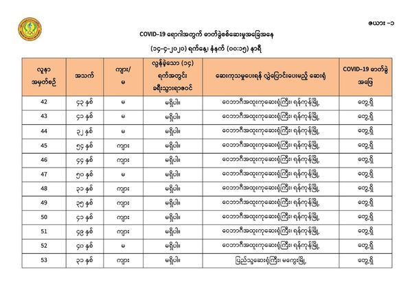 第二批94人的化验样本中,发现来自马奎省谬地(Myothit)镇1名接受隔离检疫(Quarantine)的病患者的样本中含有新冠病毒,其余93人的样本中没发现次病毒。发现此病毒的第53名确诊者(Case-53)将移送至马奎市人民医院继续就医。