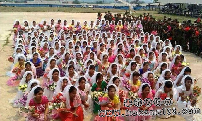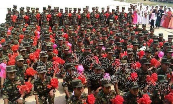 果敢资讯网4月9日据《佤邦新闻局》消息:“4.17建军节”来临之际,4月8日,联合军驻南部171军区的179名青年官兵携手新娘参加了“热爱佤邦,情定军营”为主题的集体婚礼。这样别开生面的军营集体婚礼,171军区每年都要举行。