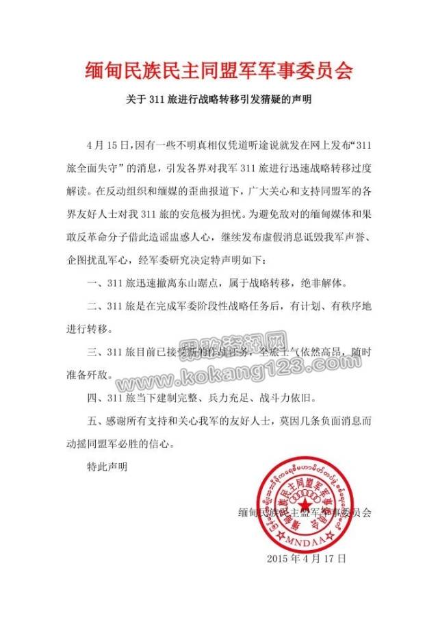 4月15日,因有一些不明真相仅凭道听途说就在网上发布“311旅全面失守”的消息,引发各界对我军311旅进行迅速战略转移过度解读。在反动组织和缅媒的歪曲报道下,广大关心和支持同盟军的各界友好人士对我311旅的安危极为担忧。为避免敌对的缅甸媒体和果敢反革命分子借此造谣蛊惑人心,继续发布虚假消息诋毁我军声誉、企图扰乱军心,经军委研究决定声明如下: